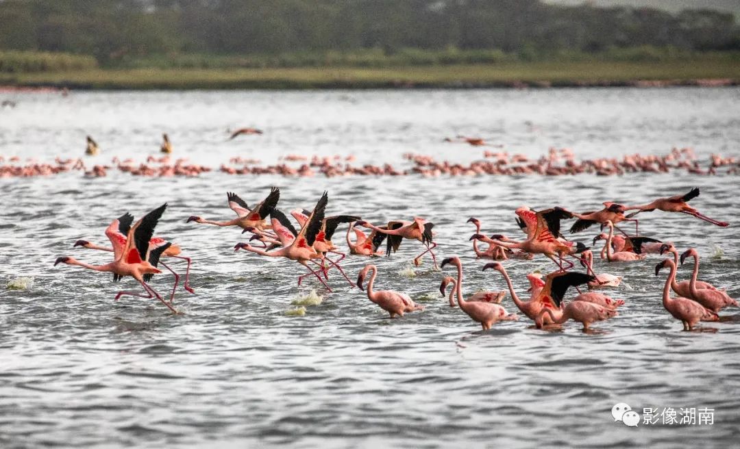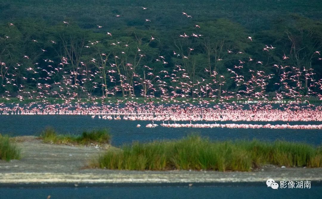 肯尼亚埃尔蒙泰塔湖里丰富的鱼虾为火烈鸟提供足够的食物,数万只火烈鸟栖息在沿湖浅滩,起飞时一呼百应,边飞边叫,极为壮观。