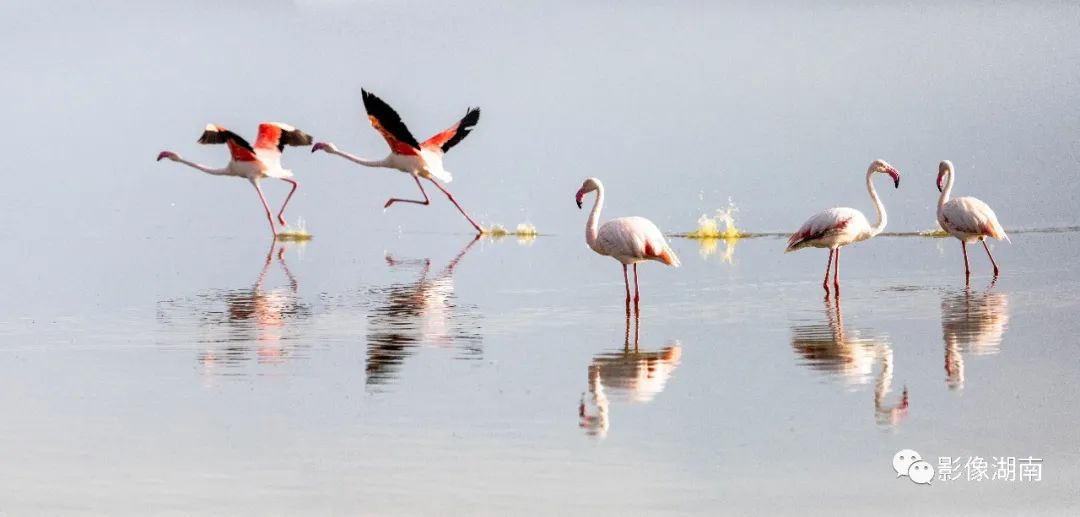 火烈鸟亦称红鹳,大小似鹳,嘴短而厚,颈长而曲,脚高而裸,羽毛深红艳丽,因似火焰而得名,神秘而极具观赏性。
