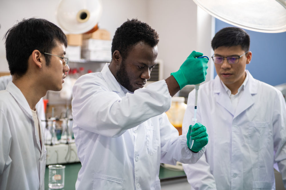 6月26日,在湖南农业大学环境微生物学实验室,尼克(中)在导师周耀渝(右)的指导下做实验。新华社记者 陈思汗 摄
