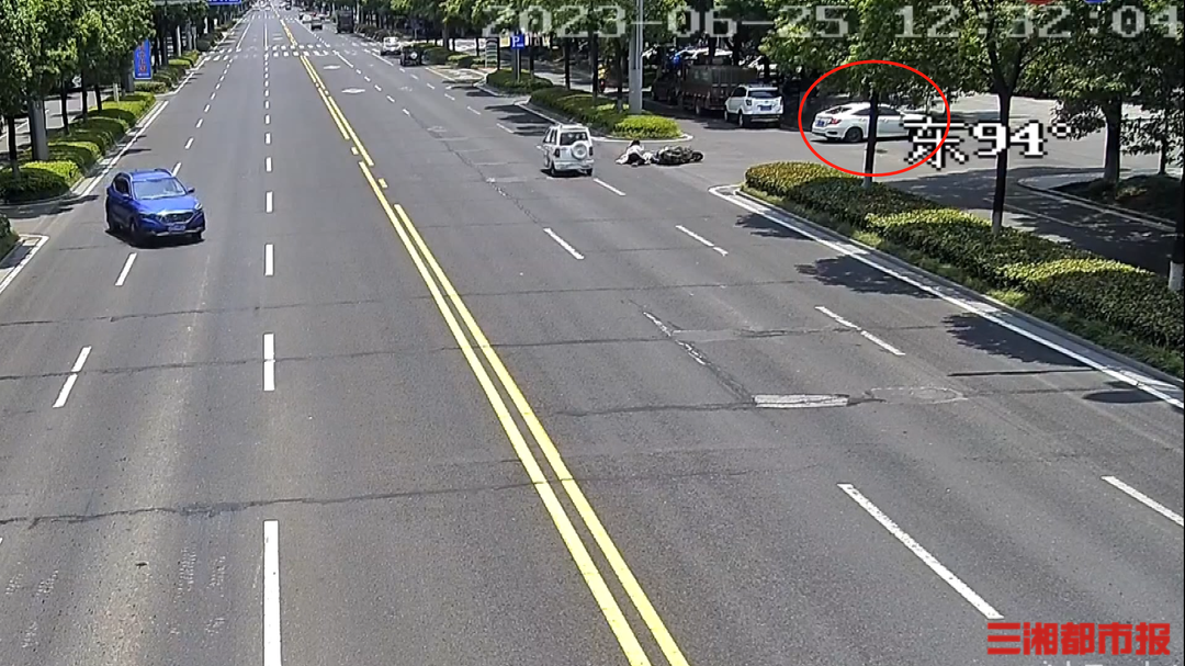 6月25日12时32分,常德津市九澧大道公共场所视频显示,由南往北方向一辆行驶在最内侧第三车道的白色小车,快速驶入画面后向右连续跨两条车道右转准备驶出主干道,导致第一车道正常行驶的摩托车刹车避让不及,连车带人摔倒在地。