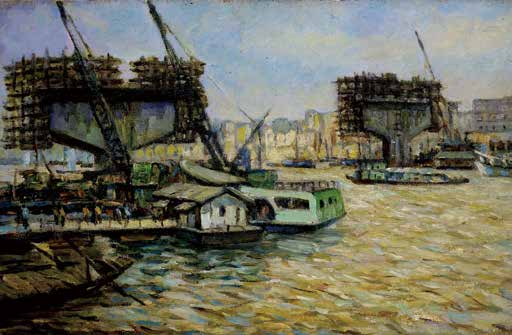 ▲李梦君油画《建设中的澧水大桥》