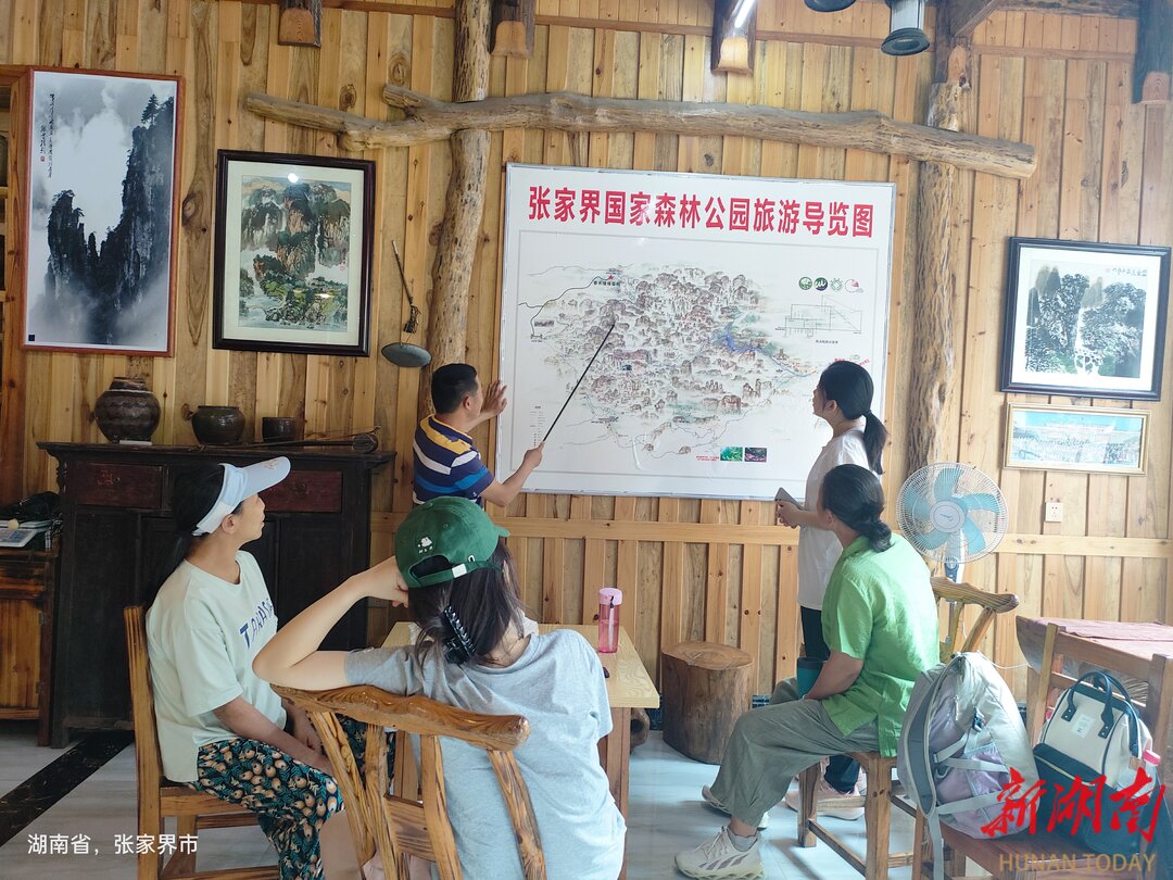 香木情缘客栈共有5层、24间房,主色调是棕黄色。走进大厅,房梁上悬挂着苞谷、辣椒,墙上贴着景区游览图。很多次,皮桂林就站在这里给入住的客人介绍武陵源核心景区的景点分布和旅游路线。