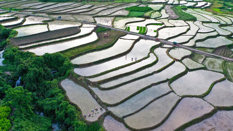 7月20日,新田县三井镇七贤山村,村民在插秧,层层叠叠的梯田与田间忙碌的身影,构成一幅美丽的夏日农耕画卷。时下正值“双抢”农忙时节,该县各地农民抢抓农时栽插晚稻,为秋粮丰产增收打下坚实基础。刘贵雄 陈祉凝 摄影报道