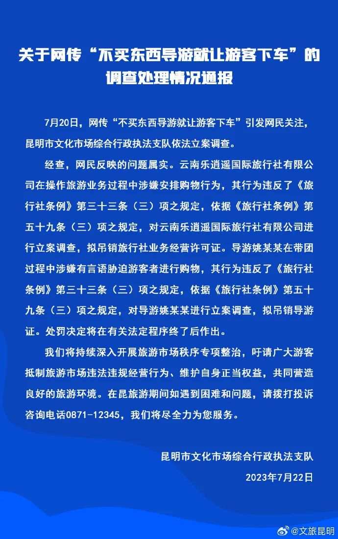 7月22日,昆明市文化市场综合行政执法支队发布情况通报称,经查,该网友反映情况属实。云南乐逍遥国际旅行社有限公司在操作旅游业务过程中涉嫌安排购物行为,拟吊销旅行社业务经营许可证。导游姚某某在带团过程中涉嫌有言语胁迫游客进行购物,拟吊销导游证。