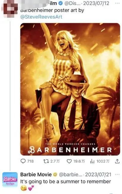 网传的合成图片上还出现了“蘑菇云”等关于原子弹的元素,《芭比》的官方推特账号还积极在一些发布“芭本海默”合成图片的帖子下留言,称“这个肯是个造型师”。