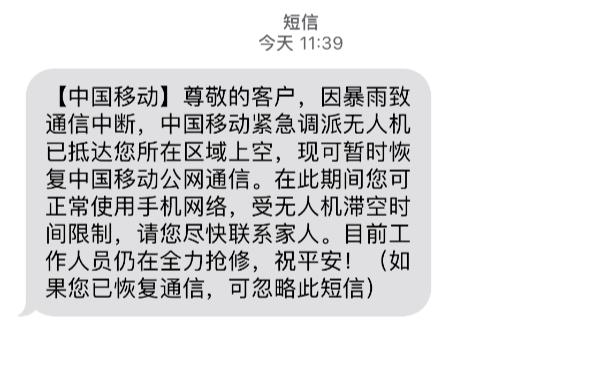 无人机起飞后,附近的居民纷纷收到北京移动发布的一条短信,内容为“中国移动紧急调派无人机已抵达您所在区域上空,现可暂时恢复中国移动公网通信。在此期间您可正常使用手机网络,受无人机滞空时间限制,请您尽快联系家人。”