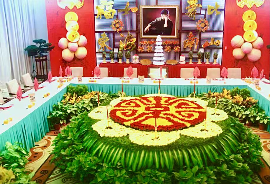 2003年8月,按照湖南的习俗,黄永玉先生进80,安排在老家凤凰举办生日宴。黄老很重视,特别从北京带来了曾在北京饭店为邓小平主持设计寿宴的专家。湖南省委也极为重视,派主管接待的副秘书长和我一起来到凤凰,省里对我的设计功底很认可,由我操刀设计的省里和国家的几次重大宴会,均取得了非常好的效果,所以省里力荐整个活动由我来设计。黄永玉一看挺为难的,也没有真正领略过我宴会设计的功夫,于是说:"干脆你们先各自出一个方案,我看哪个合适再行定夺。