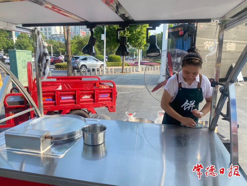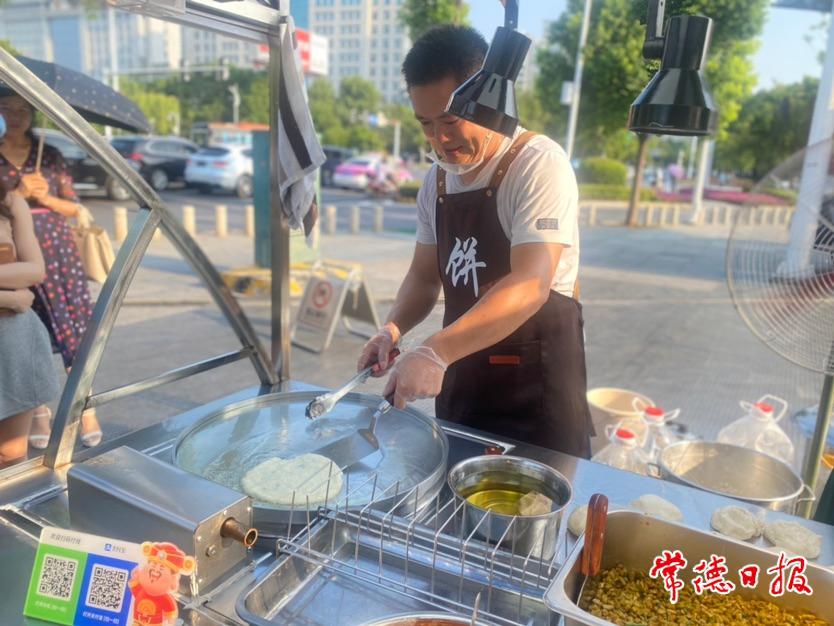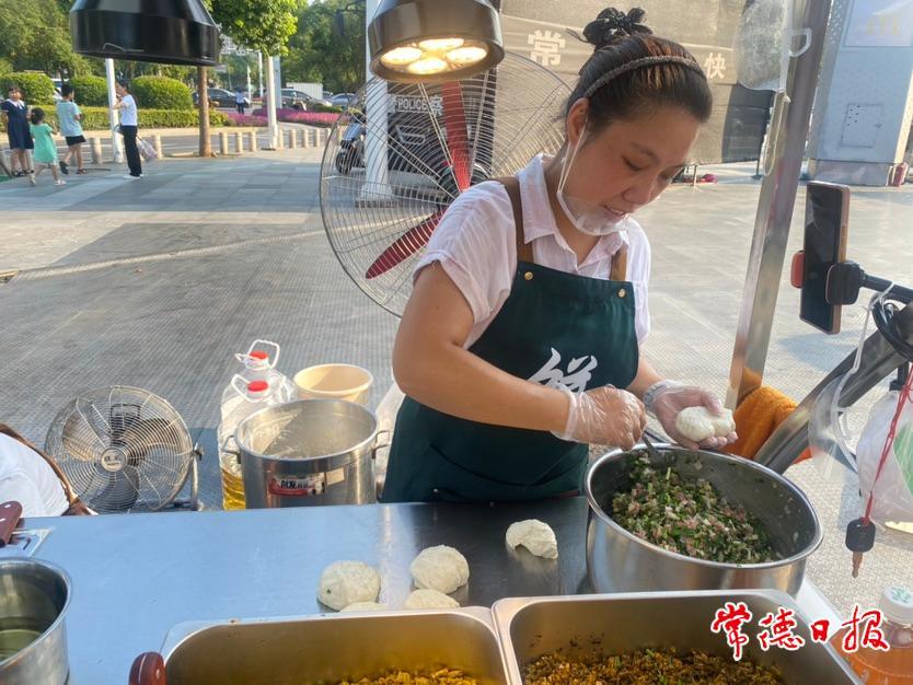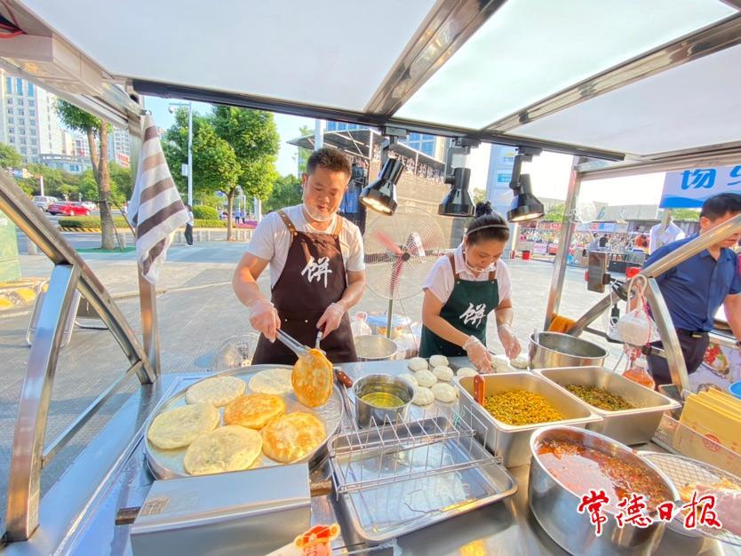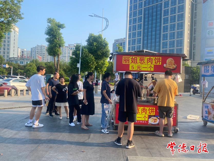 “5块钱一个,稍等一下,马上就好了啊!”8月9日17点,常德市城区万达广场星光夜市的一角,丽姐葱肉饼摊的老板于兴一边热情地招呼顾客,一边加快和面的速度,然后和妻子李陈丽将车子停靠在指定摊位上,穿好工作服,做好迎接顾客的准备。