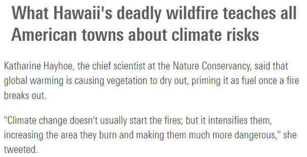 此外还有研究表明,气候变化引起的海水变暖,导致全球范围内飓风强度有增加趋势,并引发更强的风力事件,正如本次助推毛伊岛大火蔓延的强风。