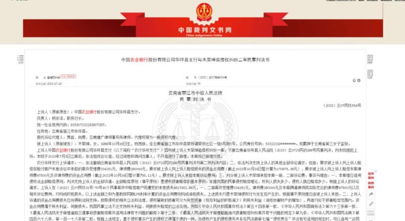 据了解,华坪县人民法院于2021年11月17日作出40份民事判决书,分别判决由农行华坪县支行赔偿40名银行客户本金、利息等损失。该行提起上诉后,二审均驳回上诉,维持原判。