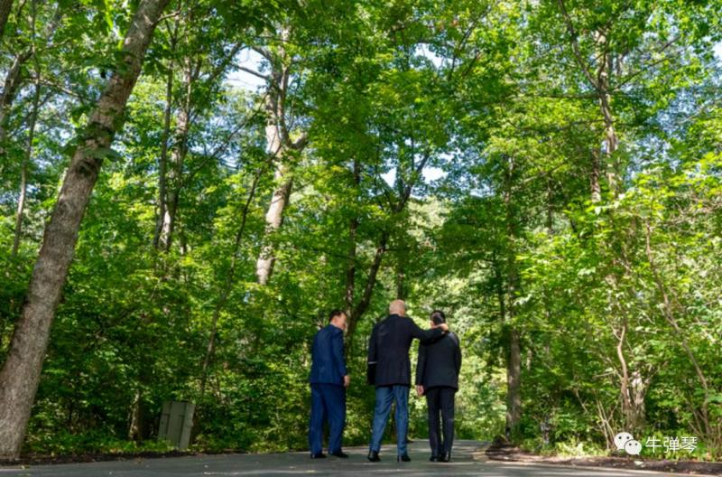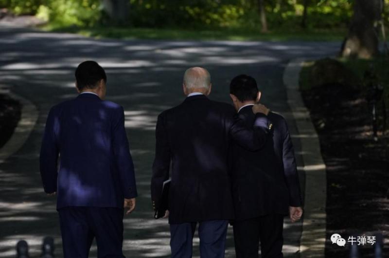 老大特意戴了一副墨镜,两个小兄弟左右紧紧跟随,嗯,照片还挺传神,这就是美日韩戴维营峰会。