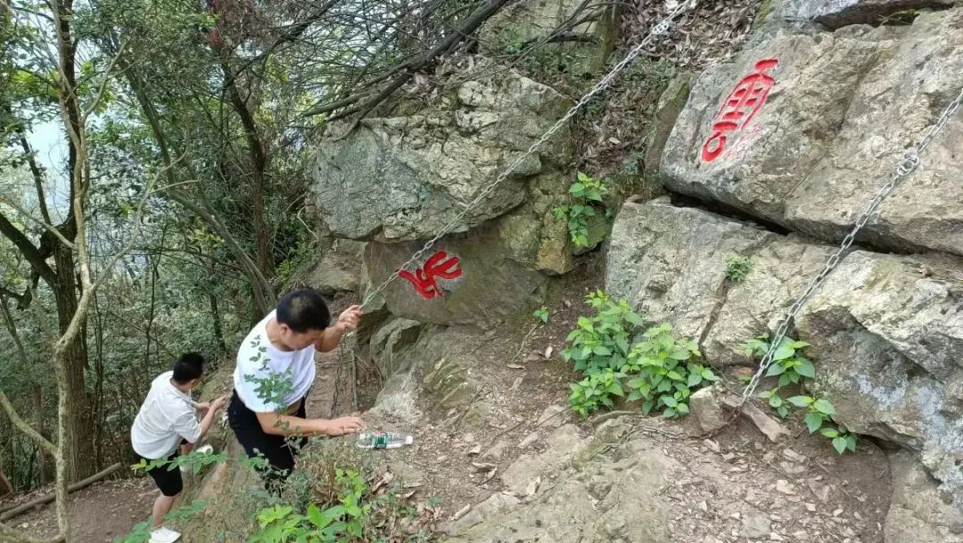 前面的路越来越陡峭,我们大口地喘着粗气。大家天南地北地一路说笑,不多久就来到了一处绝壁。要登雷打石主峰,就要从这悬崖绝壁上攀登上去。以前攀登,需要上面的人用手拉,下面的人用力托举,小心翼翼,才能攀岩通过。现在的悬崖攀爬已不再惊险了。今年春季,刘总率人在这悬崖峭壁上凿成石坎,并安装了铁链。人们在此登山只要踩着石坎拉着铁链即可轻松上山。