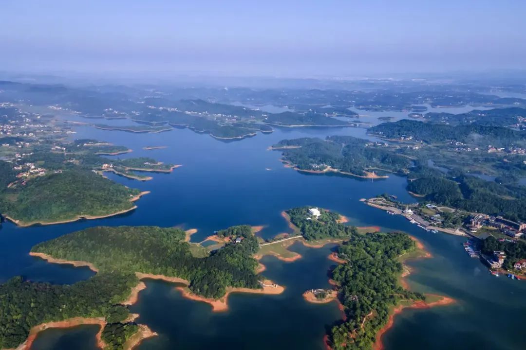 站在这高台上,极目远眺,万千美景尽收眼底。脚底下山峦涌动,恰似当年革命志士在此冲锋陷阵、激战正酣。眺望远处,浩瀚的水府庙水库(也叫溪口水库),这个比杭州西湖还大9倍的“人间瑶池”“湘中马尔代夫”,如同一块绿色的翡翠,那星罗棋布的小岛,就像翡翠上镶嵌的珍宝,构成一幅浓墨重彩的山水画。只有在这雷打石山顶,你才能揭开她神秘的面纱,窥见它的真容。这时,“淡烟疏柳一湖清,瑶池碧岛入画中”的意境,在脑海中油然而生。