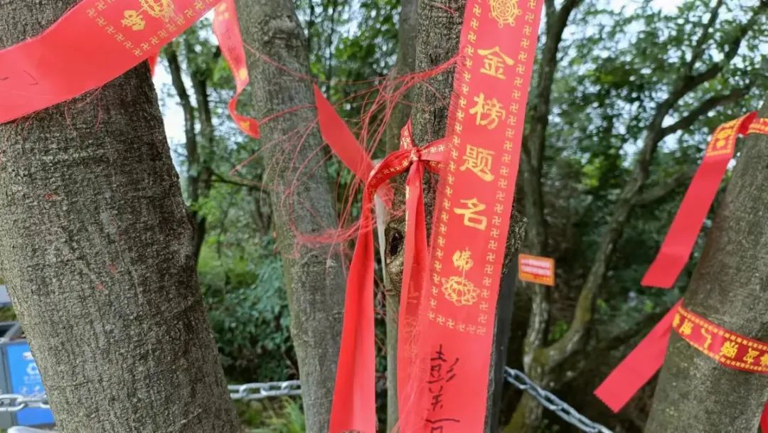 “这树上挂满了祈福条,为什么呢?”在休闲亭旁边的一棵大树上,挂满了红布条,上面写有升学、发财、当官和健康等祈福语句。