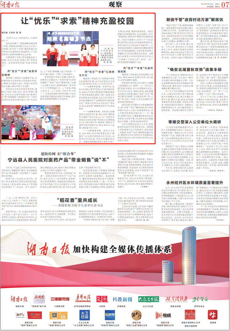 ——沁润学术氛围。30多年来,该校主办的《云梦学刊》致力于屈学特色研究,200余万字的专著《屈原学集成》被誉为“屈学界彪炳史册的工程”,屈原文化研究获批省社科基地,先后主办“屈原文化传承高峰论坛”“全国屈原学发展创新论坛”“屈原文化研究丛书首发式”等活动,相关成果获“湖湘智库研究”优秀成果奖。