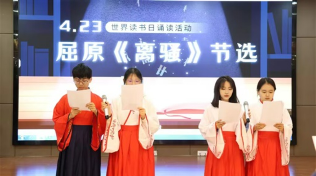 在第28个世界读书日,湖南理工学院举办屈原《离骚》节选经典诵读活动。苑煊 摄