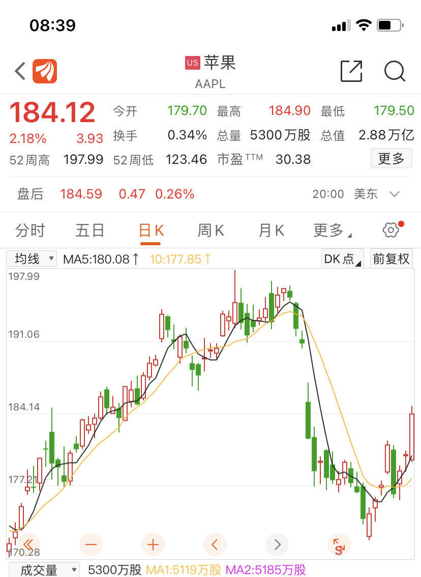 截至美股收盘,苹果(AAPL)收涨2.18%,报收184.12美元,总市值2.879万亿美元。