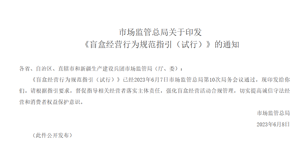 根据国家市场监督管理总局发布《盲盒经营行为规范指引(试行)》,盲盒经营者应当将商品名称、商品种类、商品样式、抽取规则、商品分布、限量商品投放数量、抽取概率、商品价值范围等关键信息以显著方式对外公示,保证消费者在购买前知晓。但在上述两款盲盒的销售过程中,均未查见相关信息。