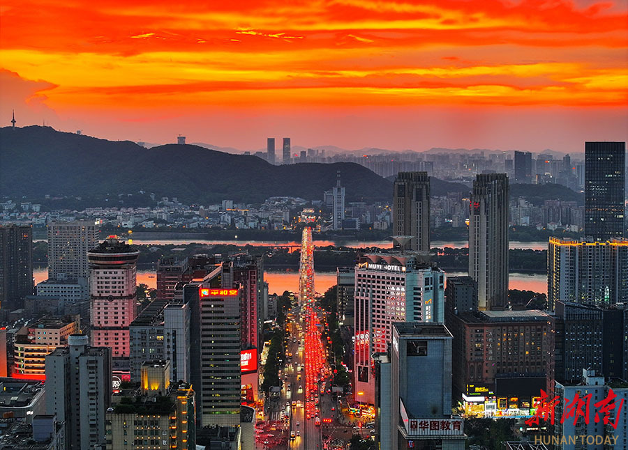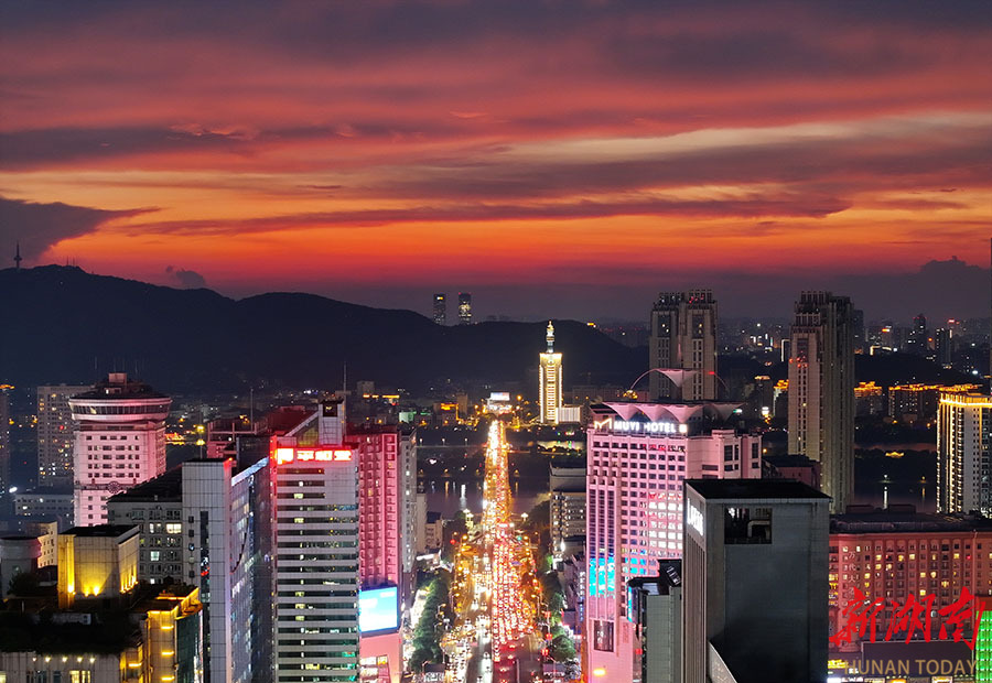 9月18日,晚霞与长沙城市灯火交相辉映,浪漫无比。湖南日报全媒体记者 童迪 摄