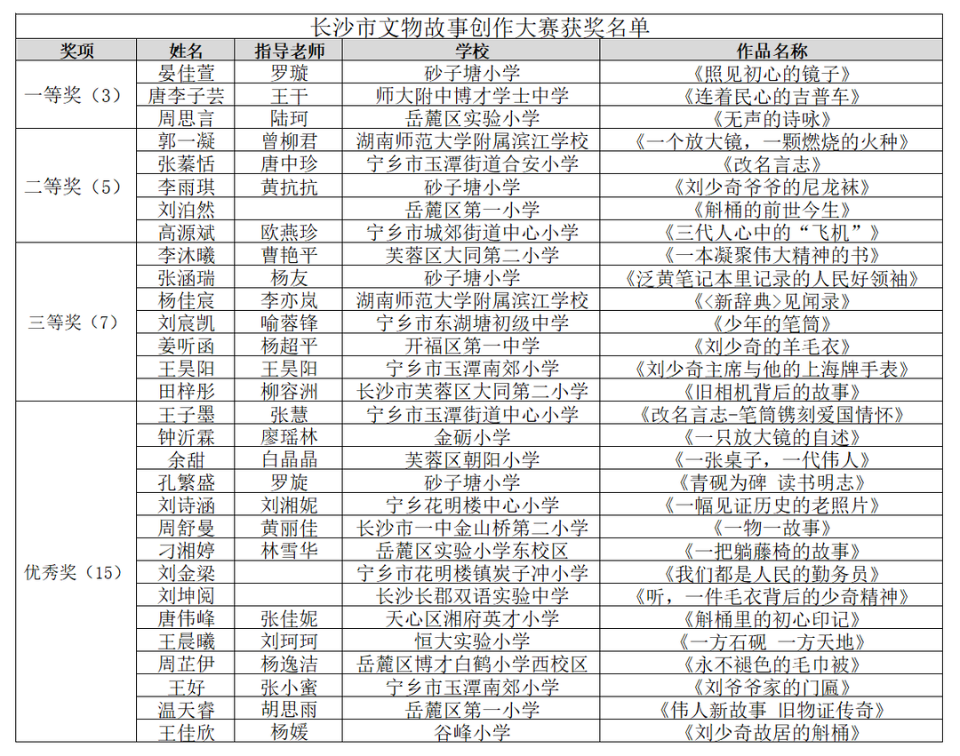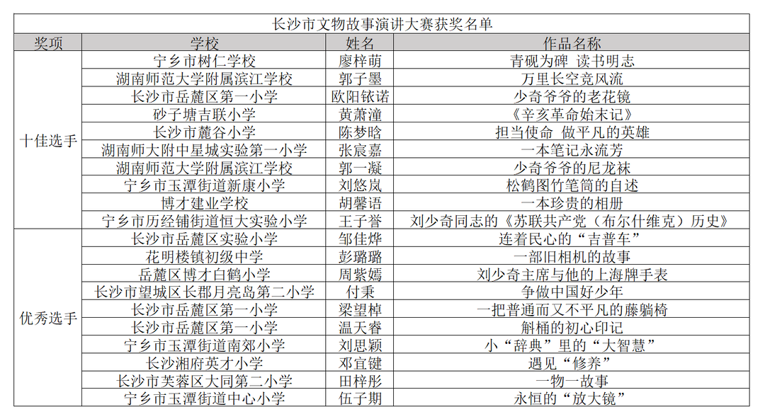 本次文物故事大赛共分为创作大赛、宣讲大赛两个赛事,设初赛、复赛和总决赛等环节。创作大赛4月份启动,在长沙市各中小学校提交的165篇参赛作品中收录了50篇优质稿件编辑入册,共评选出3个一等奖、5个二等奖、7个三等奖以及15个优秀奖。宣讲大赛自开赛以来,共有全市273位选手报名,收录了154个精彩视频,最终有20名宣讲员入围总决赛。总决赛评审采用7名专家评审与20名大众评审综合评分的方式,评选出廖梓萌、郭子墨、欧阳铱诺等“十佳选手”,邹佳烨、彭璐璐、周紫嫣等十位“优秀选手”。