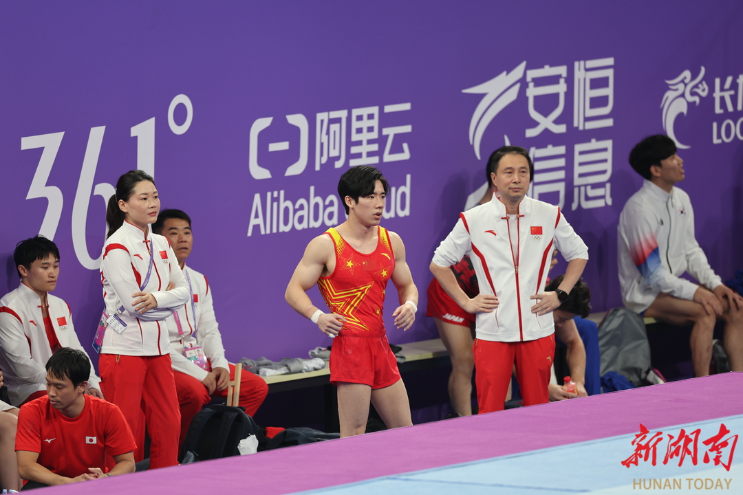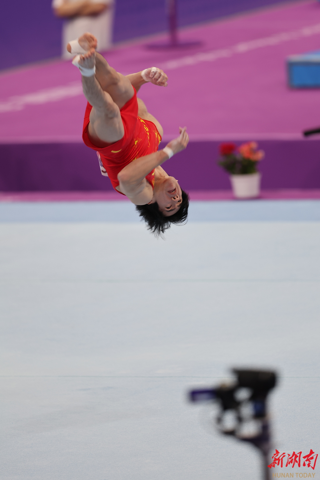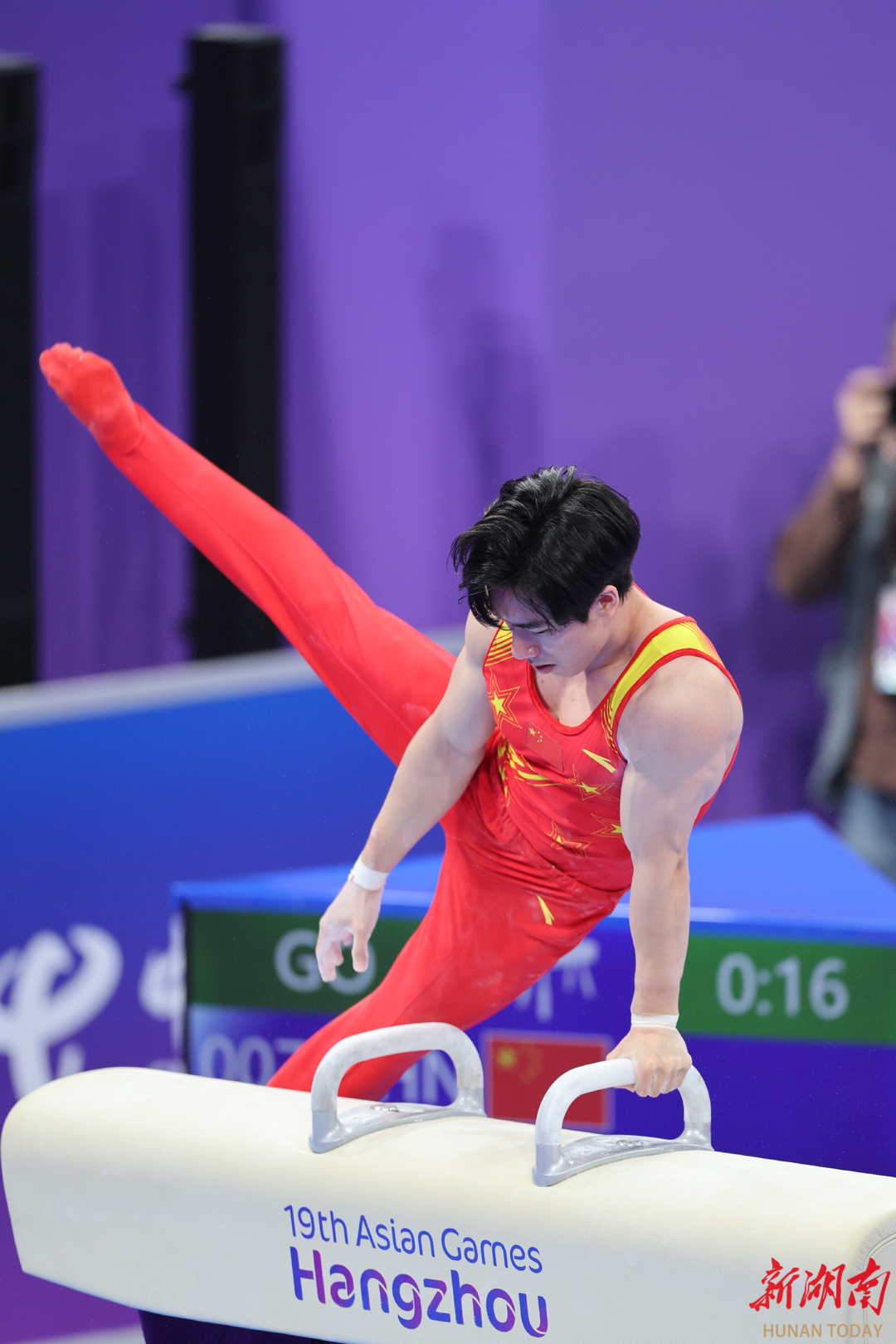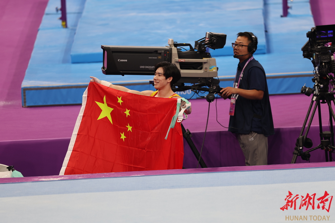 新湖南客户端9月26日讯(特派记者 胡旻)9月26日下午,杭州亚运会竞技体操男子个人全能决赛在黄龙体育馆举行,继夺得体操男团冠军后,23岁的长沙伢子张博恒以89.299分刷新了自己全能最好成绩,强势“加冕”,为中国代表团再添一金!这也是湖南运动员在本届亚运会上的第7金。(图为赛后张博恒庆祝夺冠)