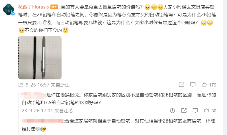 在提及网友关于眉笔价格的疑问时,花西子回应称,“真的有人会拿克重去衡量眉笔的价值吗?大家小时候去文具店买铅笔时,在2B铅笔和自动铅笔之间,你最终是因为笔芯克重才买的自动铅笔吗?”