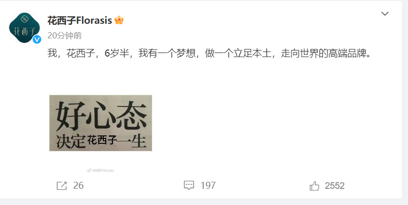 9月26日,花西子官方微博发文称:“我,花西子,6岁半,我有一个梦想,做一个立足本土,走向世界的高端品牌”,并配图“好心态,决定花西子一生”!