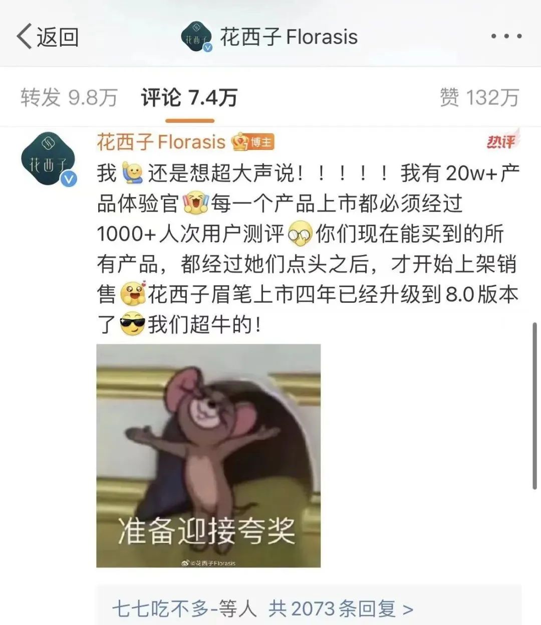 从花西子这次“发疯式”公关中可以看出,花西子不仅没有吸取李佳琦的教训,也没有学到蜂花的长处,依旧喊着“一代有一代的使命”的大话,依旧问出“真的有人拿克重衡量眉笔价值吗”的废话,这无疑是想以宏大的命题掩盖自身的缺点,以教育消费者的姿态来反击消费者,如此操作只会让品牌离消费者越来越远。