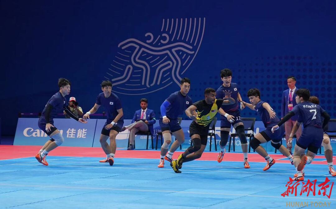 10月2日,杭州萧山瓜沥文化体育中心,杭州第19届亚运会卡巴迪项目开赛。卡巴迪起源于亚洲民间,距今已有4000多年的历史,风靡于西亚、南亚一带,运动形式上类似于中国民间“老鹰捉小鸡”的游戏。图为马来西亚队(黄)和韩国队(蓝)在比赛中。湖南日报全媒体记者 易昂 摄
