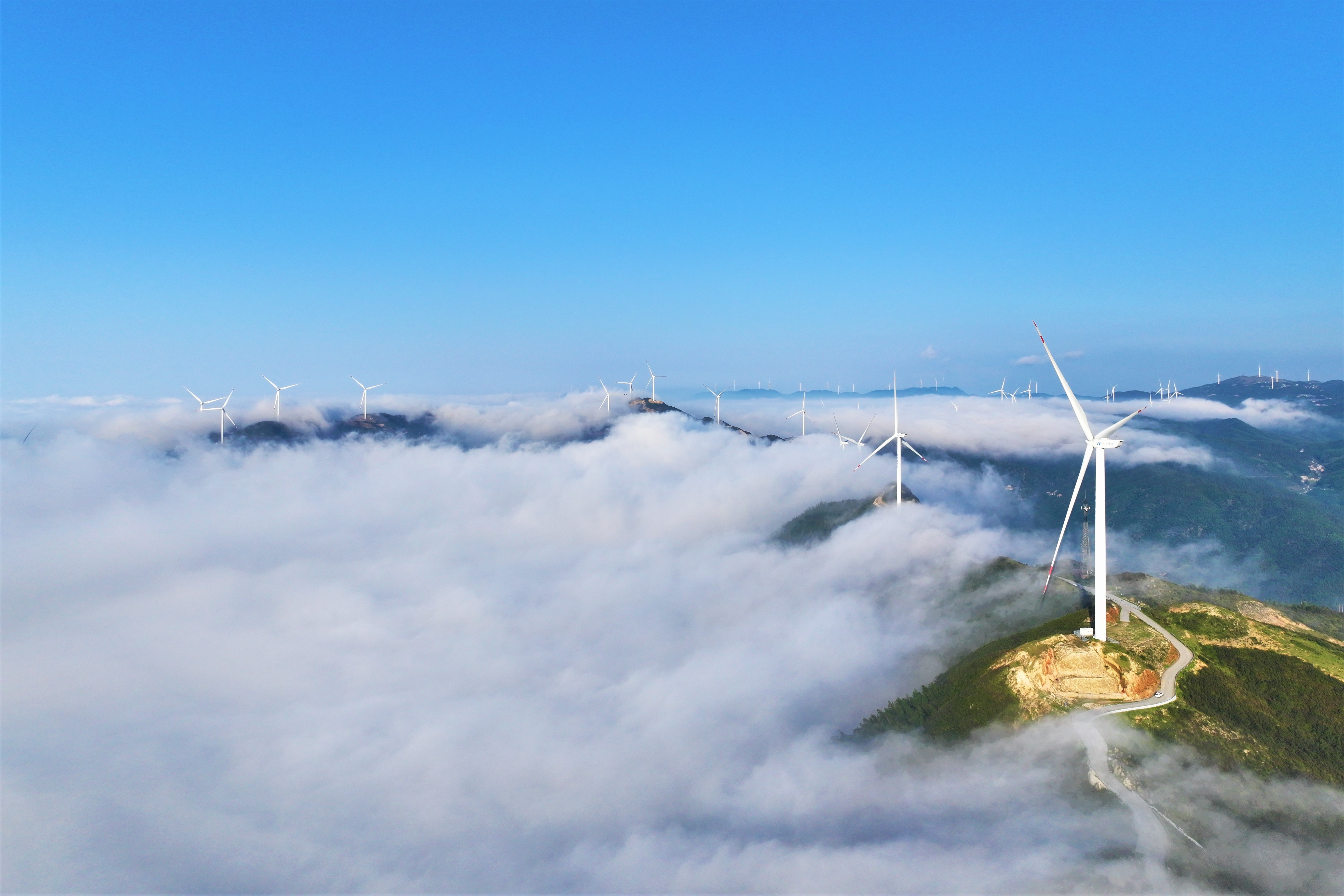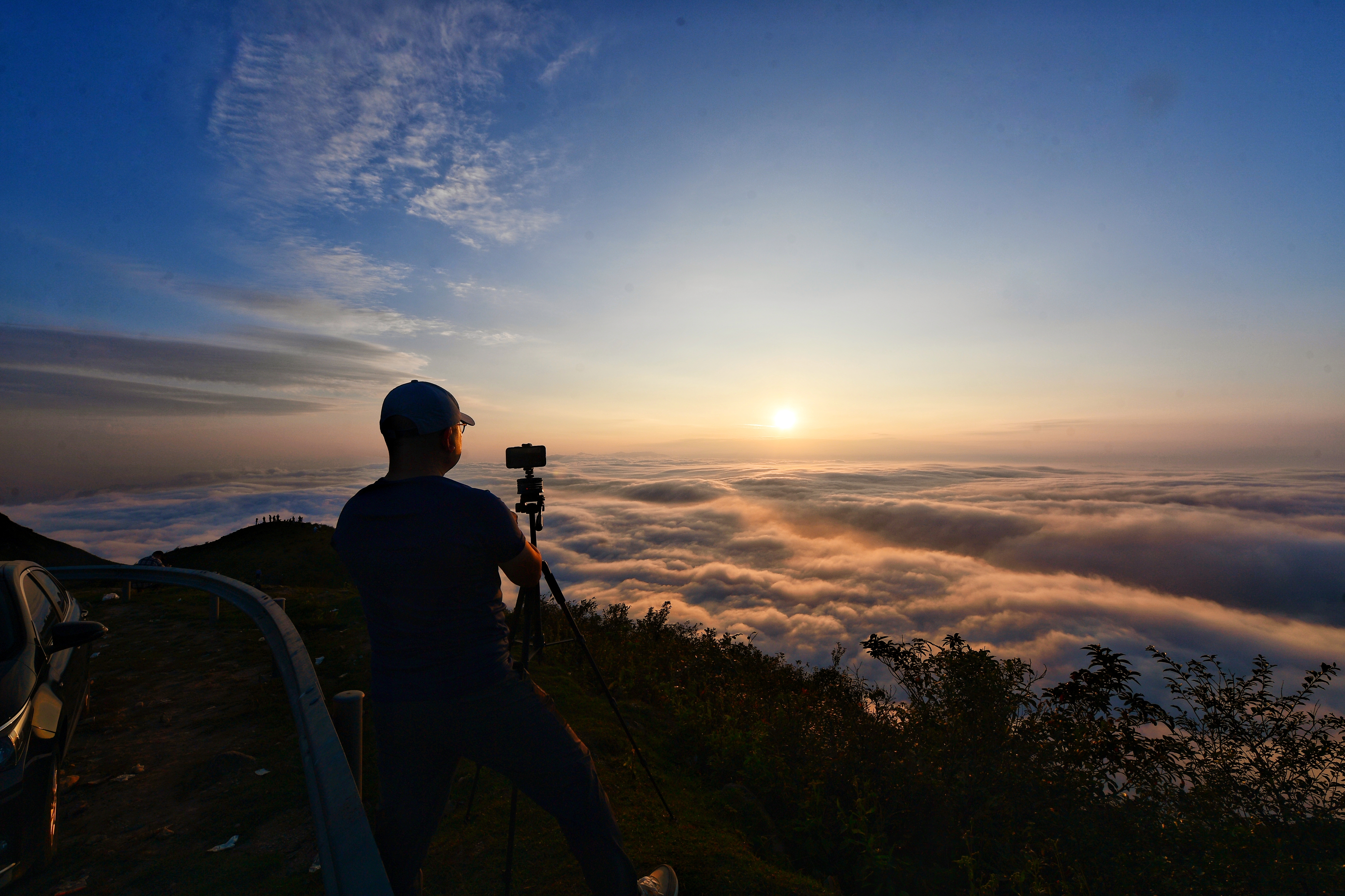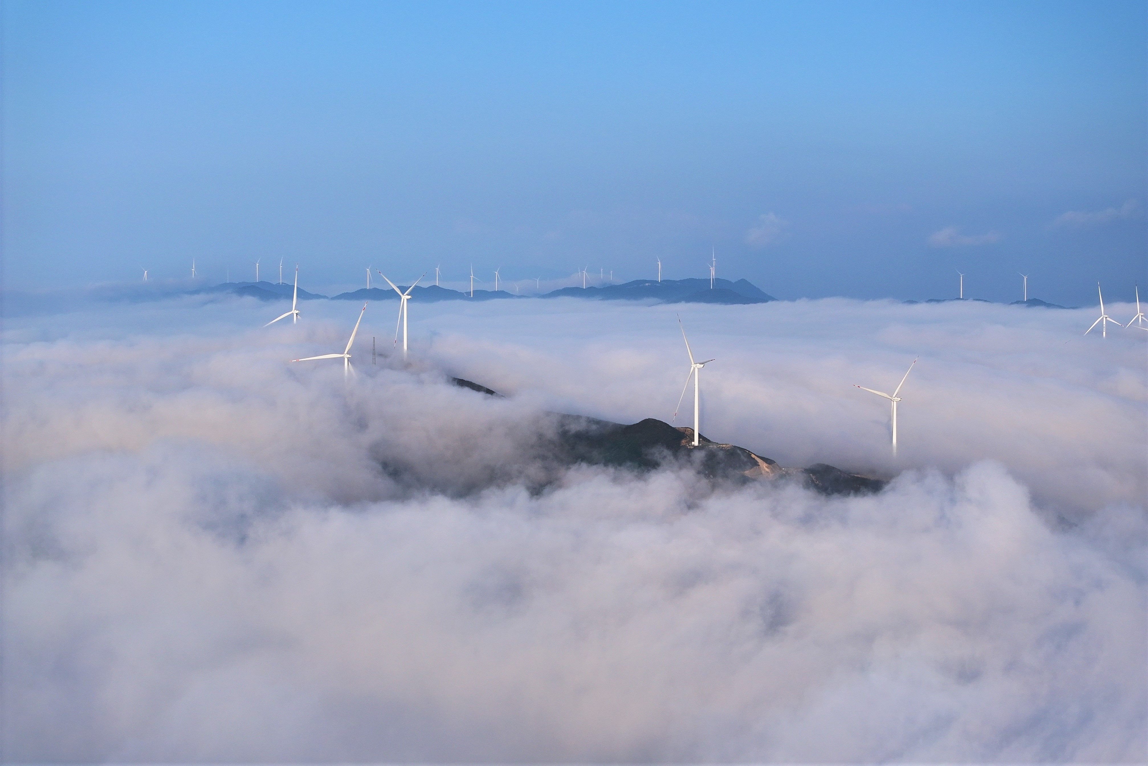 10月4日,北湖区金仙寨出现壮阔的云海景观。伴着夕阳和晚霞透过浩瀚云海,产生了绝美的丁达尔效应。站在山顶远眺,眼前是湛蓝的天空、壮阔的云海、挺拔的山峰,还有数十台风力发电机或矗立在云海之中,或沿着山脉轮廓拔地而起,巨大的扇叶在风中旋转,云海肆意翻腾,绘制出一幅醉人的景观。许多慕名而来的游客纷纷拿出无人机、手机和相机拍照留念。