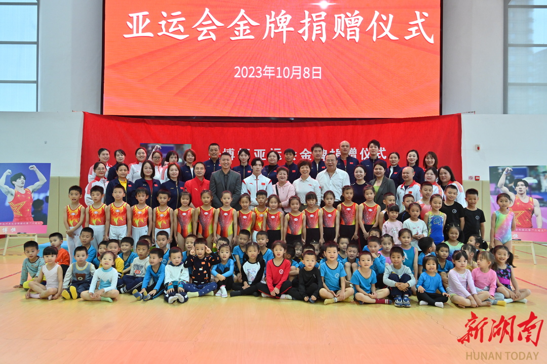新湖南客户端10月9日讯(记者 胡旻 陈沫佚)杭州亚运会竞技体操赛中,“00后”长沙伢子张博恒以3金1银出色战绩结束了本届亚运会征程。10月8日下午,为感谢母校——长沙市体操学校的培育之恩,激励更多的学弟学妹们奋勇拼搏,张博恒来到母校并将获得的一枚冠军奖牌捐赠给学校,同时,为正在训练的小师弟师妹们加油鼓励。长沙市人民政府副市长高文棋参加捐赠仪式,长沙市体育局局长苏敏芳主持。