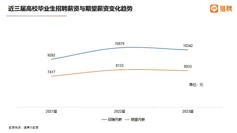 10月11日,猎聘大数据研究院发布《全国高校毕业生就业趋势与展望2023》(下称报告),列举了近年来全国高校毕业生整体招聘就业趋势。报告显示,相比2022届,2023届高校毕业生招聘薪资和期望薪资略有下降,但较2021届有明显提升。