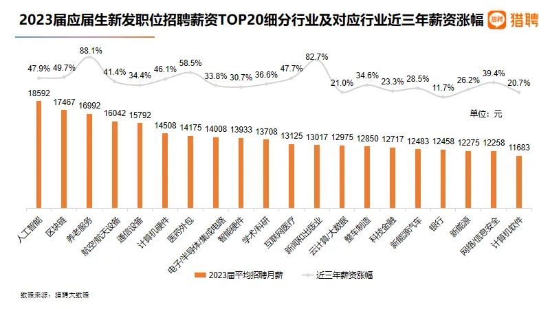 报告显示,从各细分行业2023届应届生新发职位平均招聘月薪来看,人工智能以18592元位居第一;区块链、养老服务、航空/航天设备分别以17467元、16992元、16042元位居第二至第四。