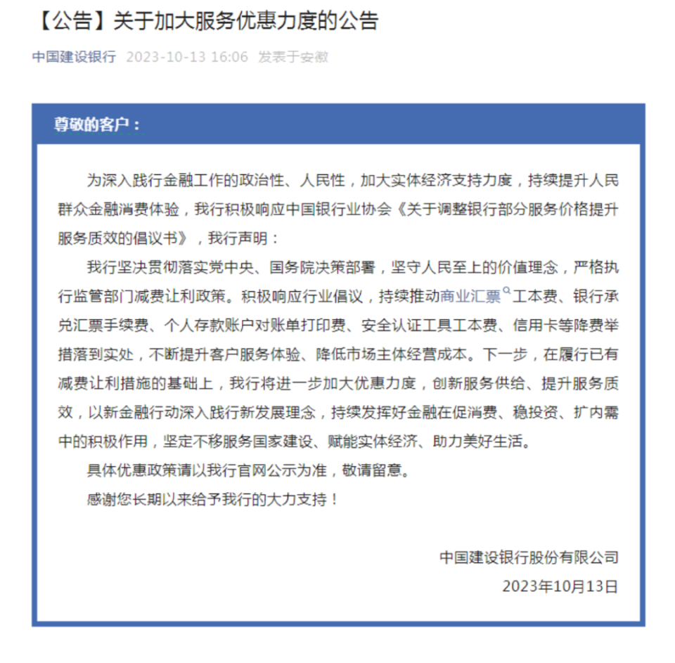截至10月13日,工商银行、中国银行、建设银行、中国农业银行、交通银行等已发布公告称,将积极响应中国银行业协会倡议,加大减费让利力度、持续优化客户金融体验,但具体实施细则及实施时间有待后续公布。