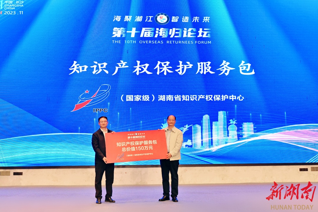 新湖南客户端11月5日讯(通讯员 戴孙强 陈志萍)11月4日,2023年度“湖南省留学人员创业启动支持计划”项目选拔大赛决赛在长沙圆满举办。在第十届海归论坛闭幕式上,我省首个针对海归等高层次人才的“知识产权保护服务包”正式揭晓,省知识产权保护中心与省专家服务中心完成了赠送交接仪式。