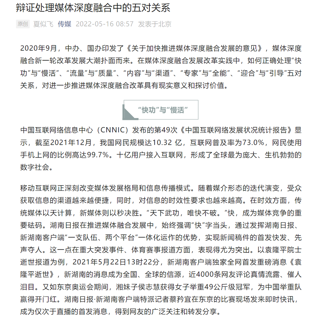湖南日报新闻业务研究《辩证处理媒体深度融合中的五对关系》获二等奖