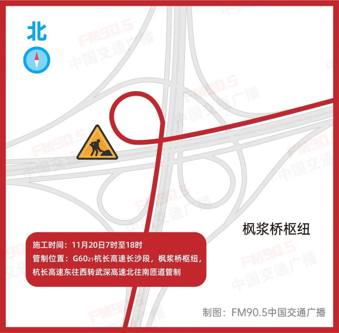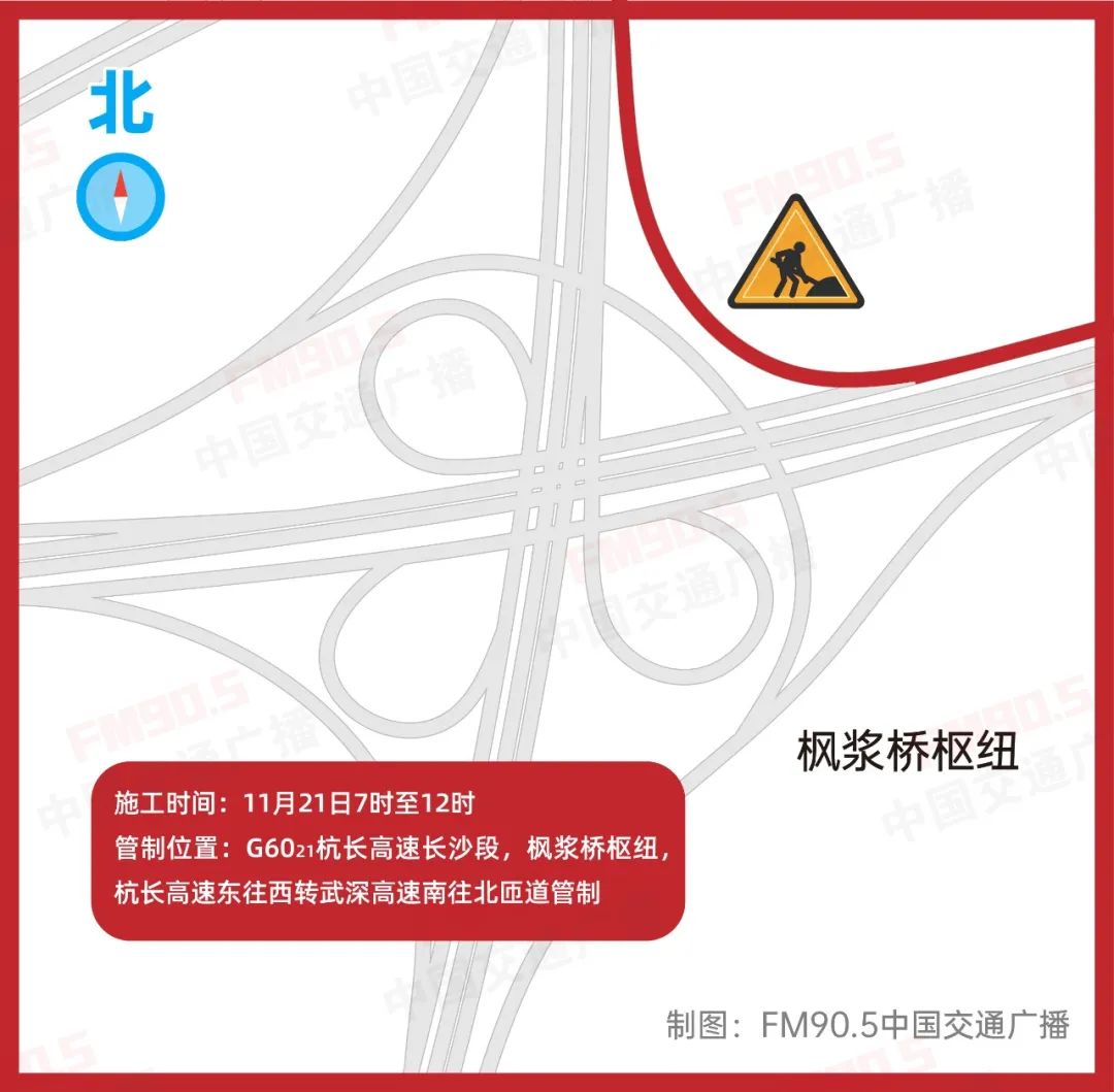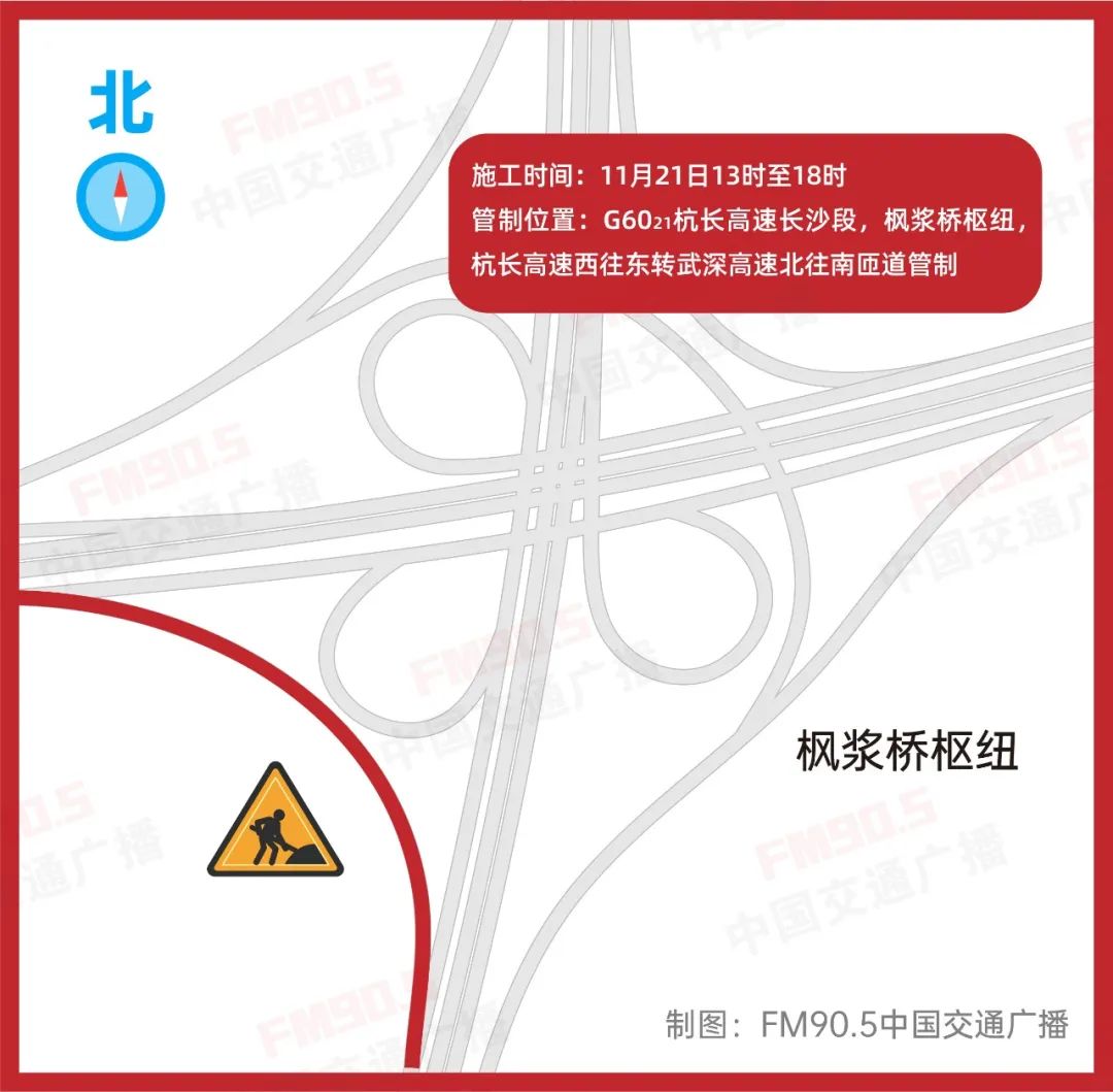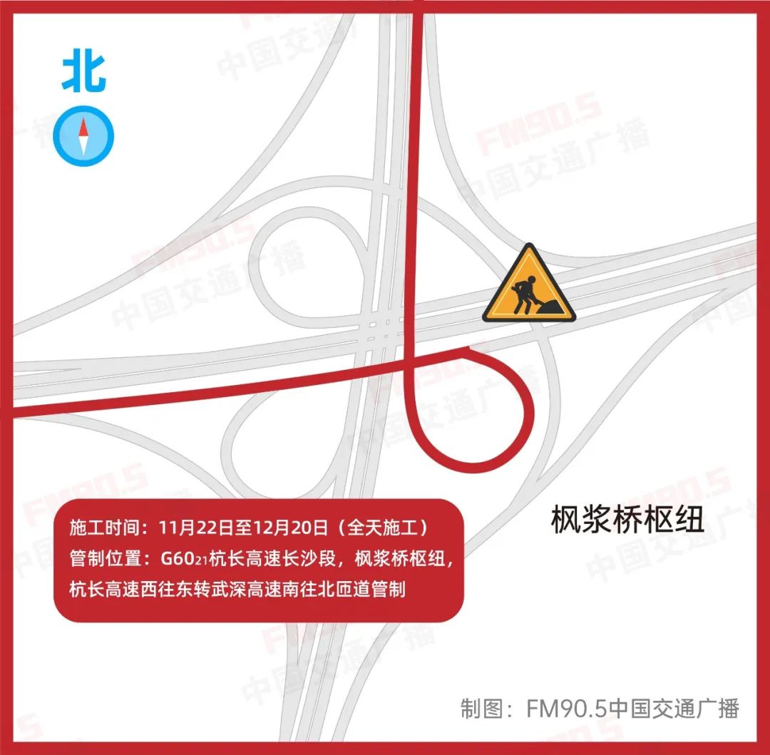 G6021杭长高速长沙段枫浆桥枢纽,杭长高速东往西转G0422武深高速北往南匝道管制。