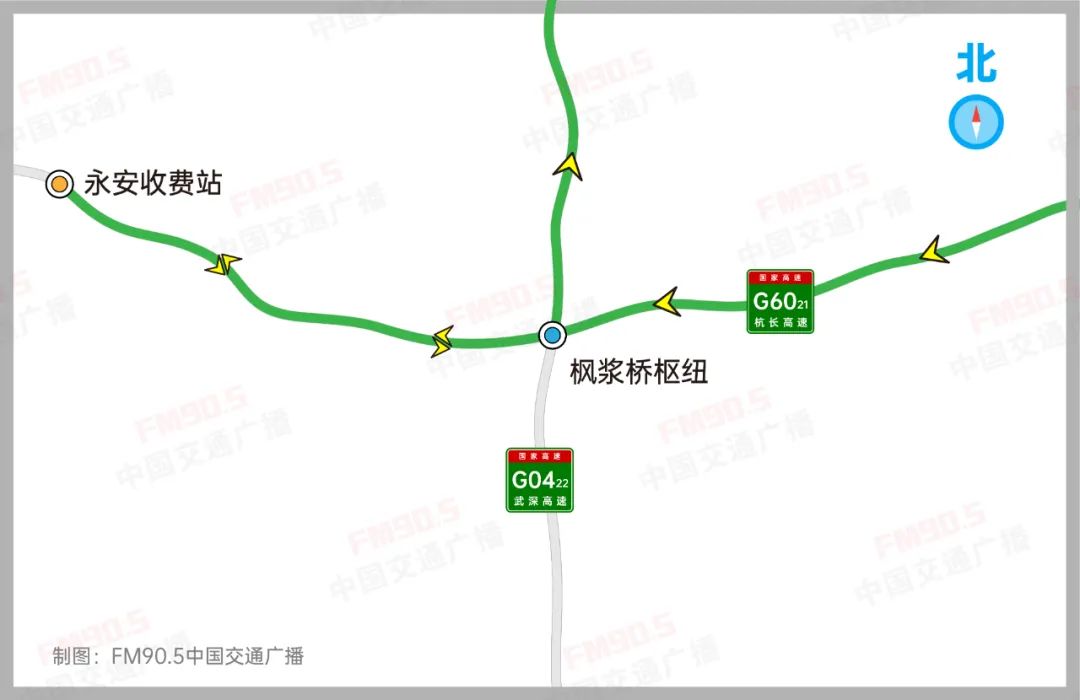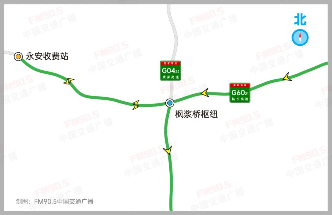 建议各位驾驶员沿着G6021杭长高速东往西方向,行驶至永安收费站掉头往浏阳方向,至枫浆桥枢纽再转G0422武深高速南下。