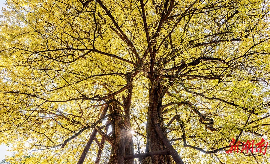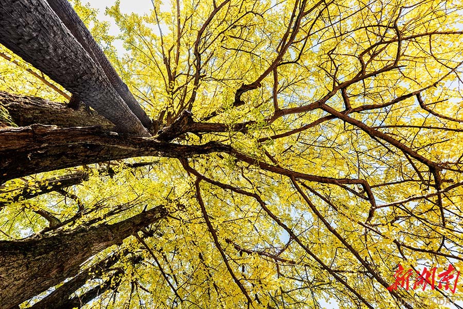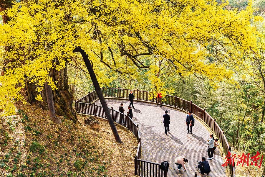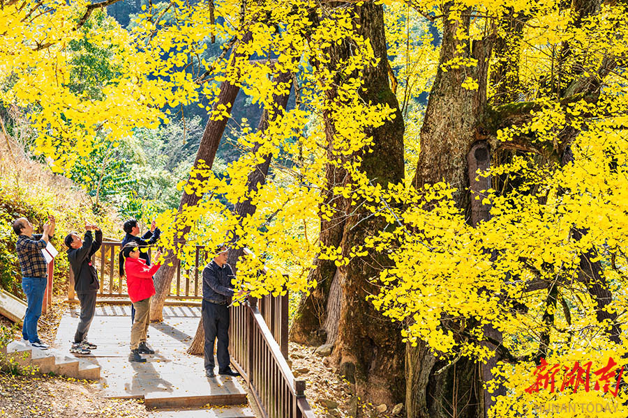 11月22日,国家森林乡村——东安县南桥镇寺门马皇村,游客在古银杏树下游玩。该树距今有2500多年历史,初冬时节,满树尽披“黄金甲”,吸引不少游客前来打卡游玩。蔡小平 摄