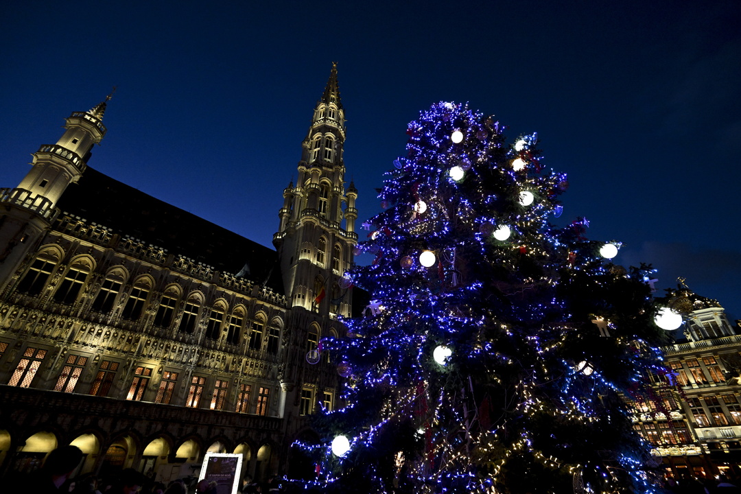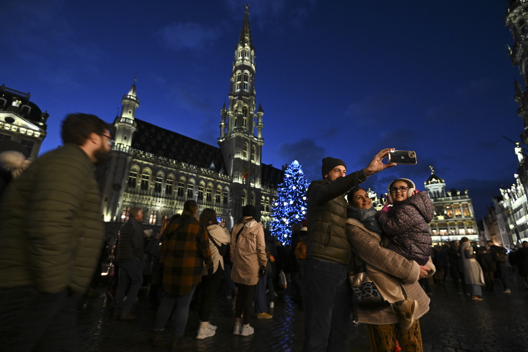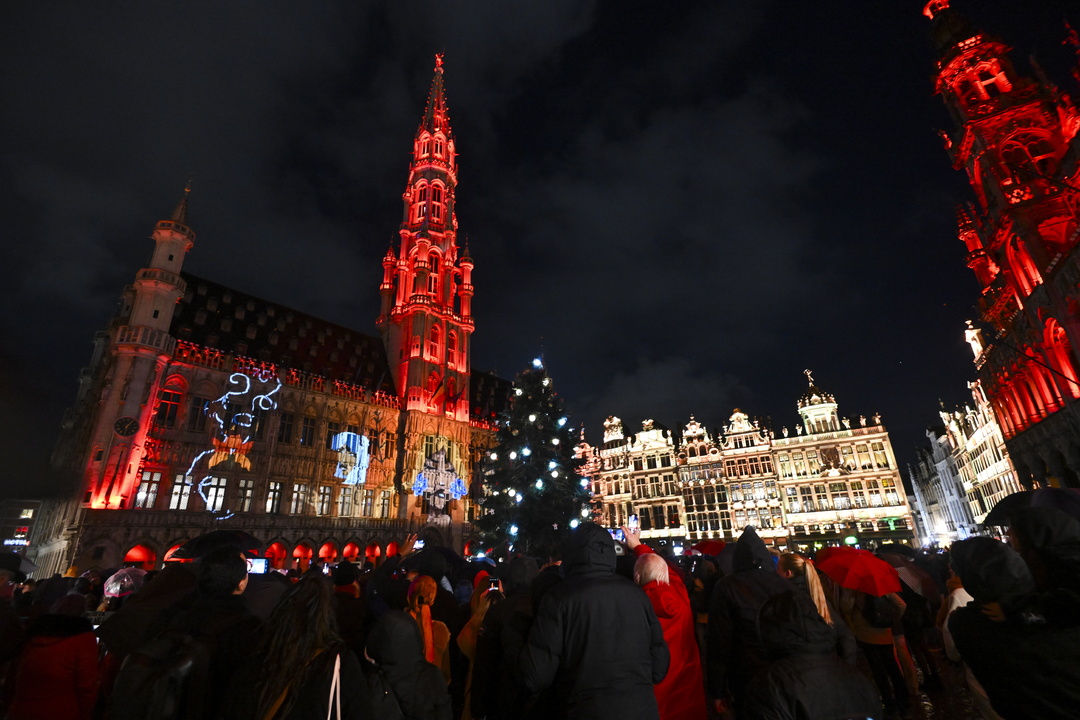 11月25日,人们在比利时布鲁塞尔大广场欣赏声光秀。新华社 发