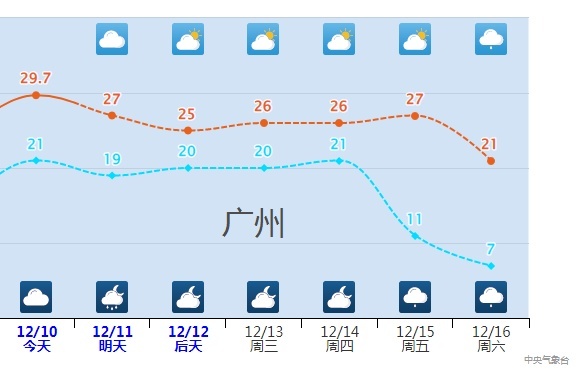 下周的寒潮过程还能影响到广东、广西、福建、海南等地,像广州,14日最低气温还有21℃,16日就降至7℃,必须要翻出厚被子了。