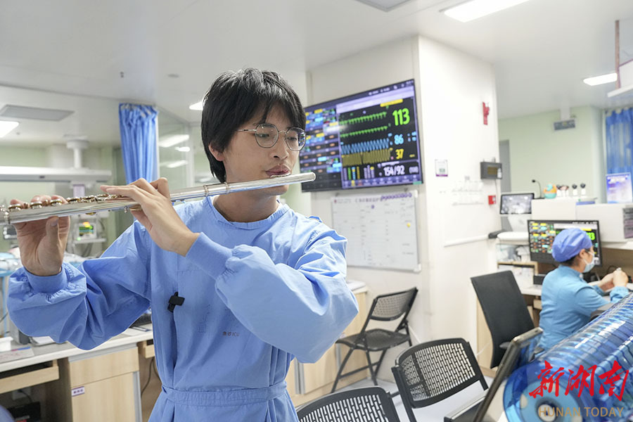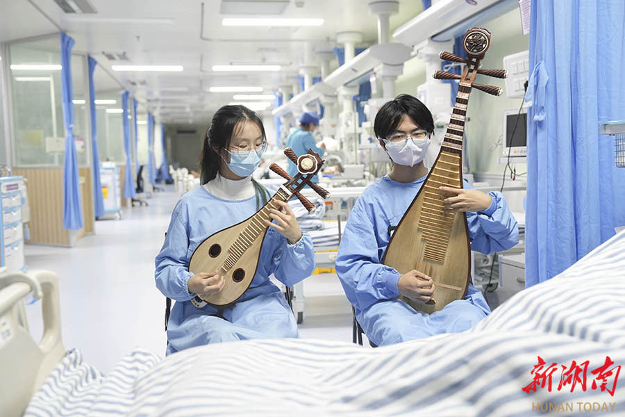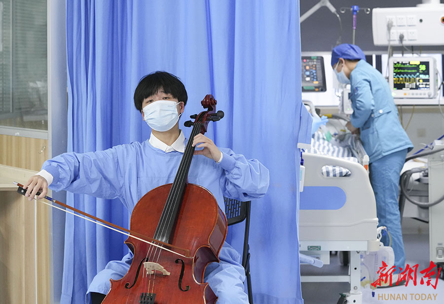12月10日,湖南省人民医院岳麓山院区,学生在急诊三部ICU演奏世界名曲。当天,该医院邀请湖南师范大学音乐学院学习大提琴、长笛、琵琶和柳琴等乐器演奏的学生走进病房,义务为病人演奏舒缓优美的音乐名曲,帮助患者缓解疾病带来的痛苦。湖南日报全媒体记者 辜鹏博 通讯员 周瑾容 摄影报道