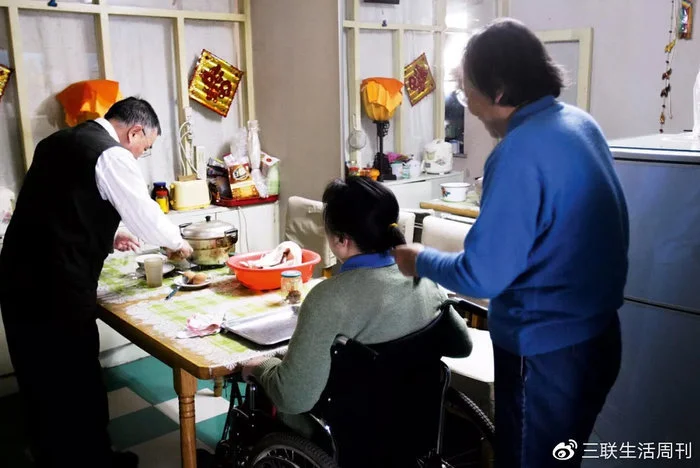 朱令的家庭生活情景之一:母亲在为其梳理头发,父亲在准备早餐(摄于2009年)