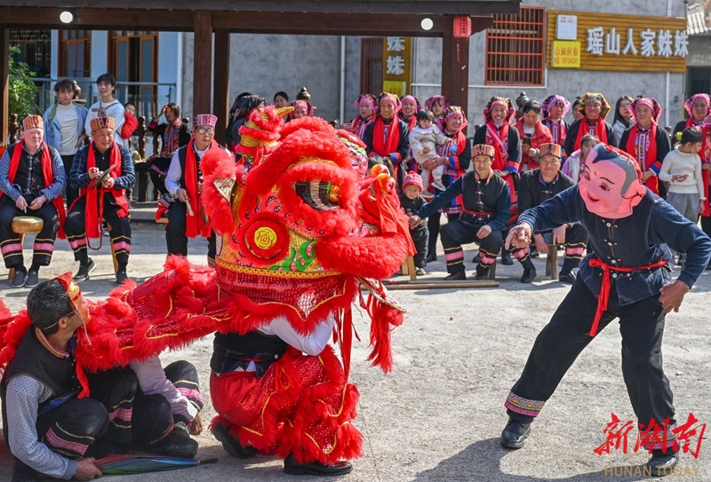 2023年12月30日,村民在为游客表演瑶族传统舞狮子。元旦假期,宜章县莽山瑶族乡西岭村跳石子瑶寨举行形式多样的民俗活动,迎接新年。湖南日报全媒体记者 郭立亮 通讯员 邓加亮 摄影报道