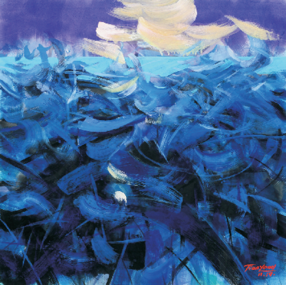 “这些画,我看第一眼时就很吃惊:冰蓝雪白,漫天孤独;再看,在旷野和雪意间,有大片的色块推搡堆积,跃动着,诉说着;晕染的墨迹,硬朗的反差,是与某种空白对抗的存在。墨迹于画布如此。我们,人的生命,在时间河流中,又何尝不是如此飘零,又如此较劲。”重庆市作家协会会员、作家敖斯汀说。