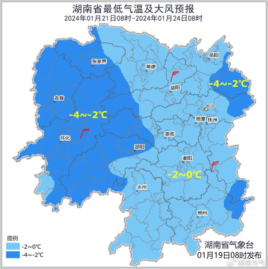 湖南省1月21日8时至24日8时最低气温及大风预报图