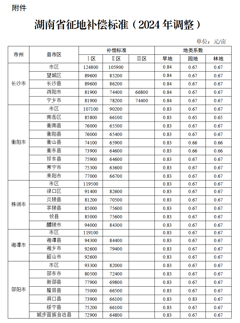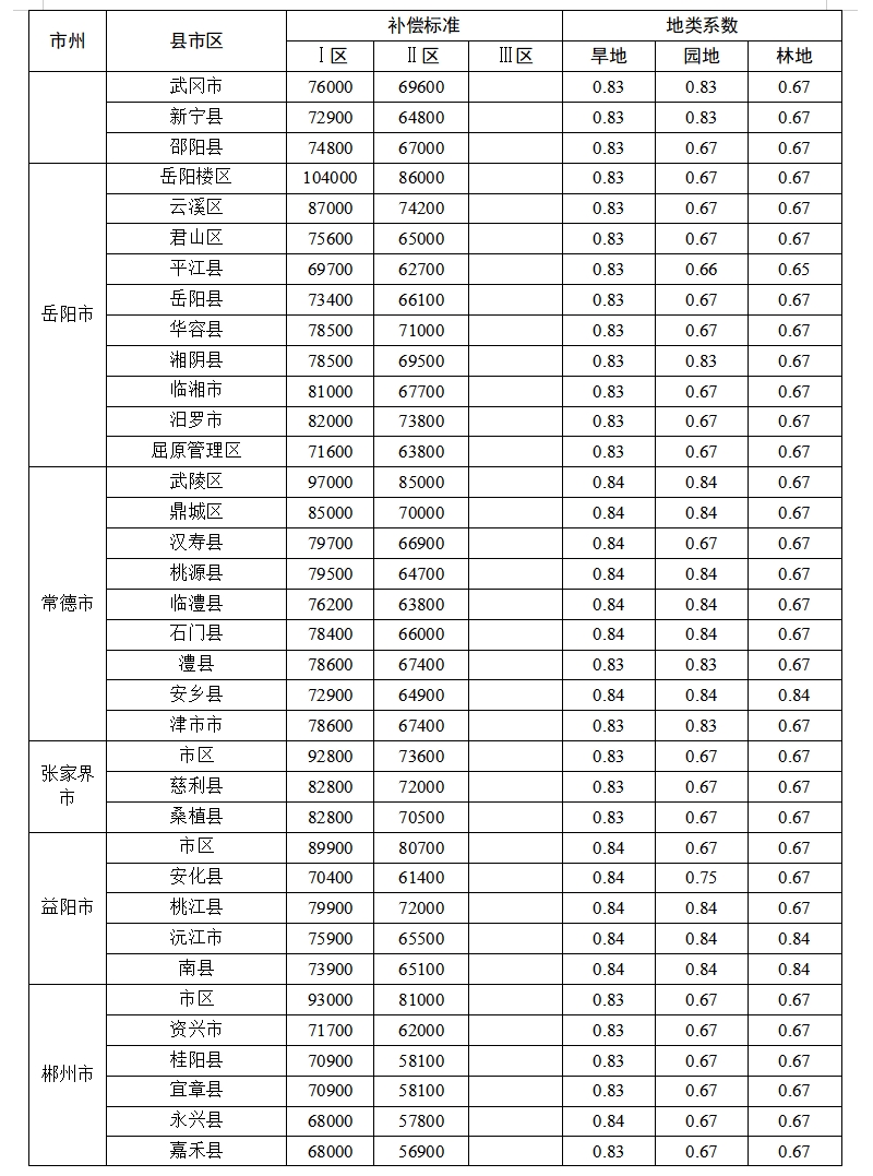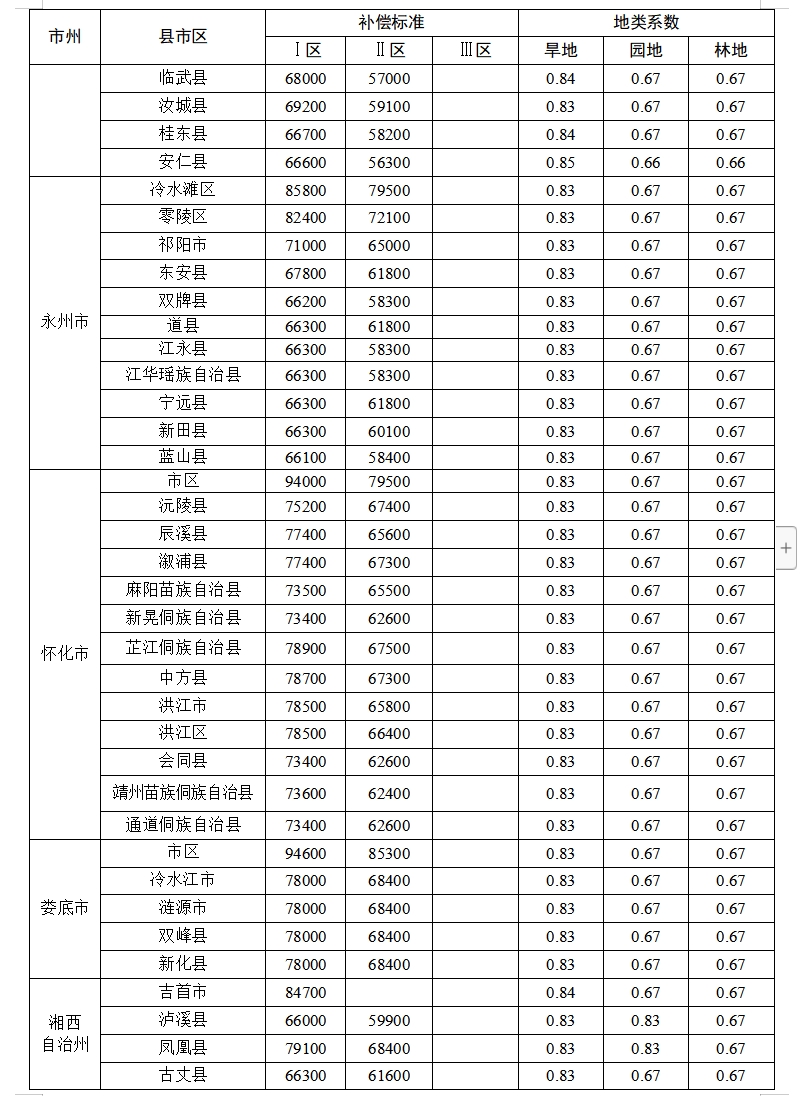 根据《中华人民共和国土地管理法》《中华人民共和国土地管理法实施条例》《湖南省实施〈中华人民共和国土地管理法〉办法》相关规定和自然资源部有关文件精神,结合我省征地补偿工作实际,现将调整后的《湖南省征地补偿标准》予以公布,并就有关事项通知如下: