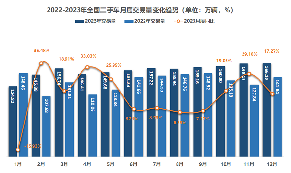 去年12月,全国二手车市场交易量166.1万辆,环比增长0.6%,同比增长17.3%,交易金额为1087.8亿元。其中,新能源二手车交易8.73万辆,环比增长1.2%,同比增长115.0%。