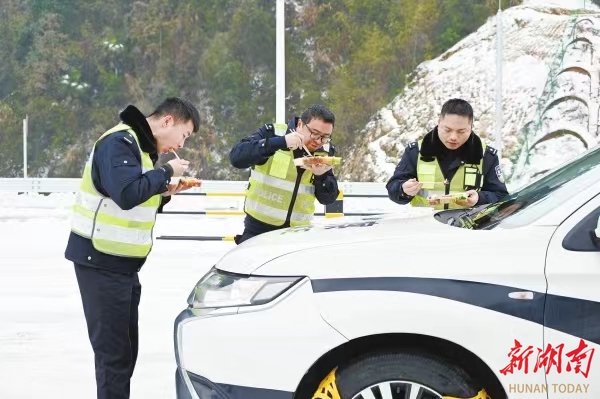 2月6日,值守民警在汽车引擎盖上吃盒饭。安化县公安局组织警力在高速入口、国省道等交通要道24小时值守。郭公平 摄(湖南图片库)