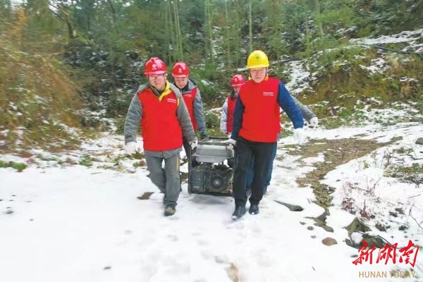 2月6日,龙山县石羔街道西洛村,国网龙山县供电公司员工在雪地里抬送便携式汽油发电机。 田良东 摄(湖南图片库)